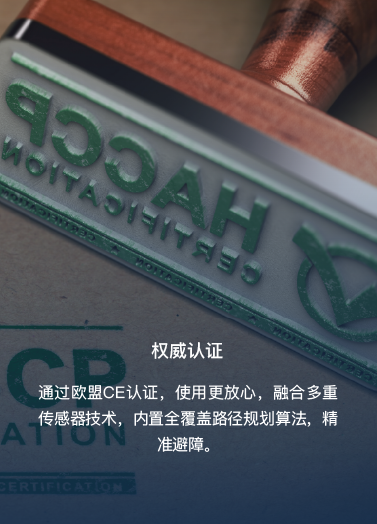 通過歐盟CE認(rèn)證,使用更放心,融合多重傳感器技術(shù),內(nèi)置全覆蓋路徑規(guī)劃算法,精準(zhǔn)避障。